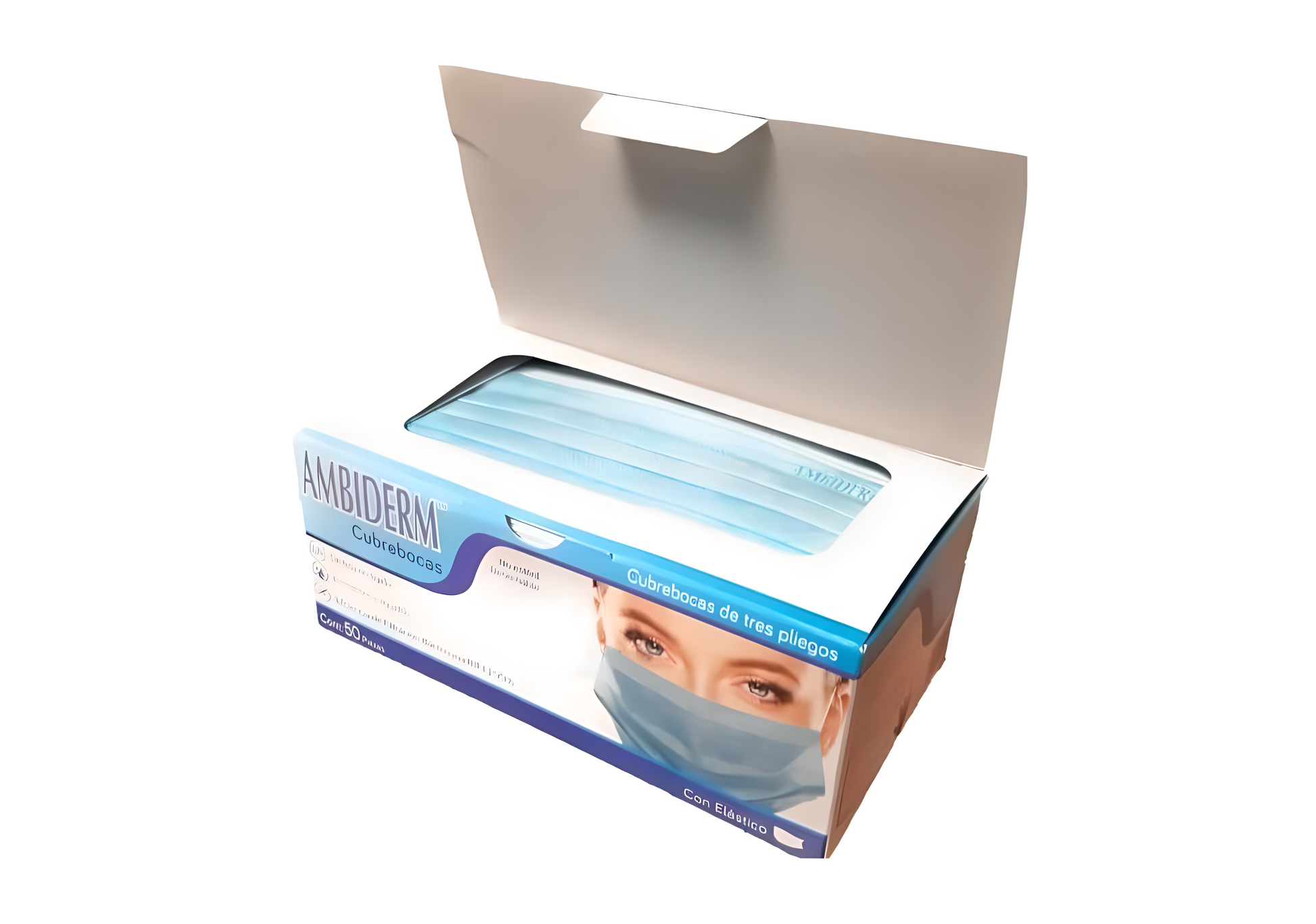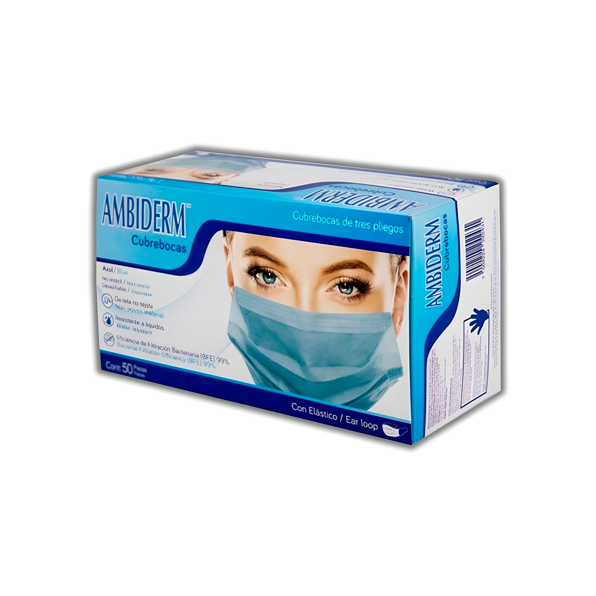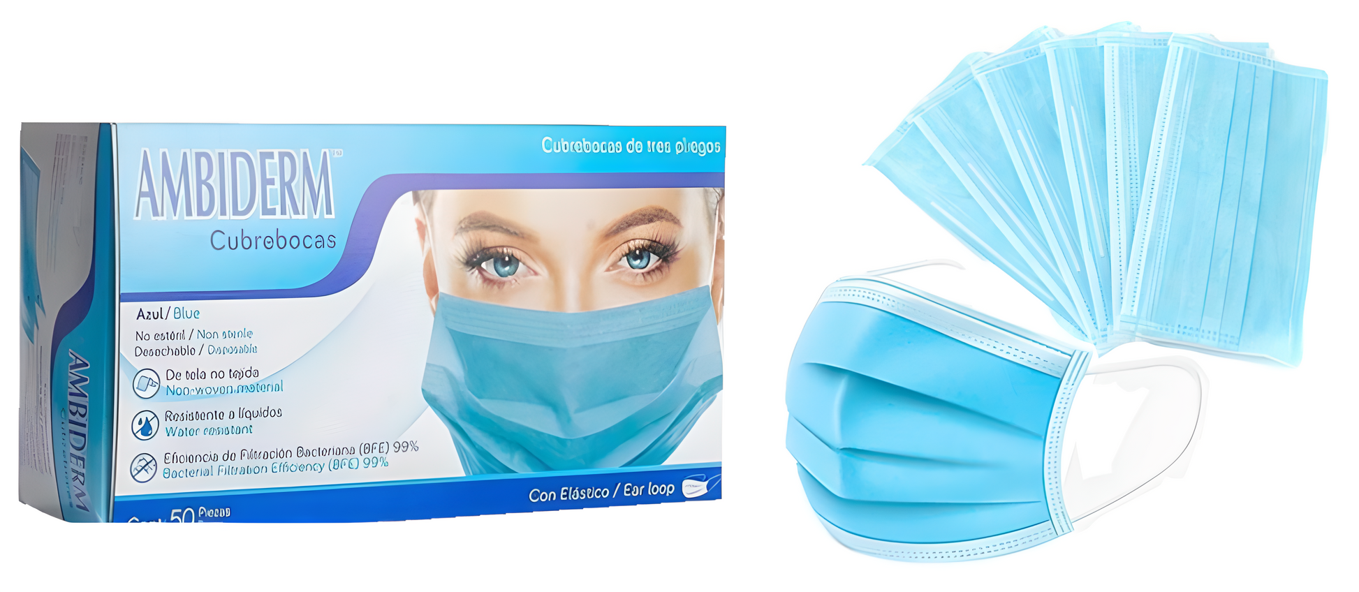 Mascarillas quirúrgicas de tres pliegos con filtro antibacteriano, elaboradas con tela no tejida en colores. Eficiencia de filtración bacteriana (BFE) mayor o igual a 98%, con Filtro bacteriano, superficie suave, resistente a líquidos, tela no tejida de 3 pliegos, n o estéril, desechable, con elástico y ajuste nasal caja con 50 piezas.