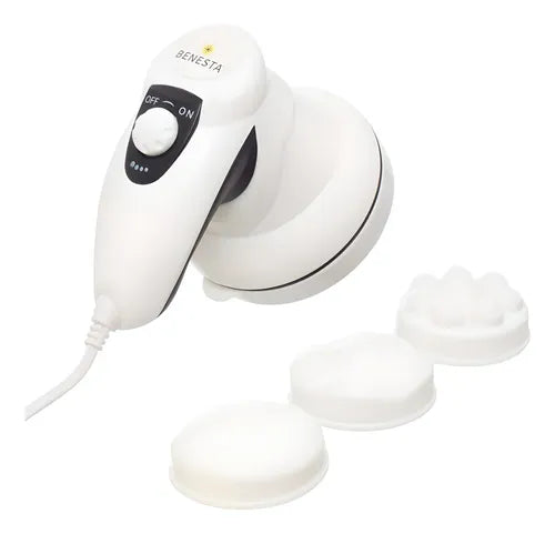 Masajeador relajante, tonificante de acción circular Benesta con 3 cabezales intercambiables, fácil de operar, transportar y almacenar. Ideal para terapia y usos en Spa. Cuenta con un potente motor que hace vibrar las partes del cuerpo donde la grasa se acumula y aguanta.