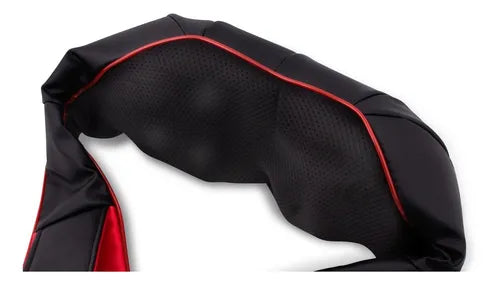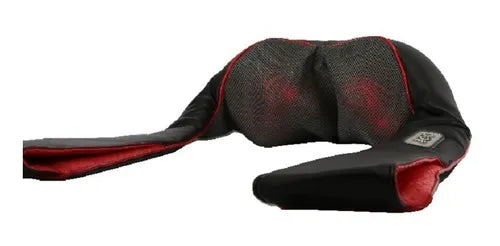 Masajeador de cuello y hombros. Tiene sosten de brazos para fácil manejo con 4 mecanismos de rodillos y calefacción integrada. Se puede colocar en cuello y espalda alta además de hombros para alivio de dolor por estrés, tensión muscular, etc. Ligero y fácil de transportar.